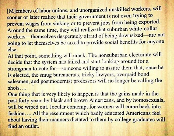 One thing that is very likely to happen is that the gains made in the past forty years by black and brown Americans, and by homosexuals, will be wiped out. Jocular contempt for women will come back into fashion... All the resentment which badly educated Americans feel about having their manners dictated to them by college graduates will find an outlet."